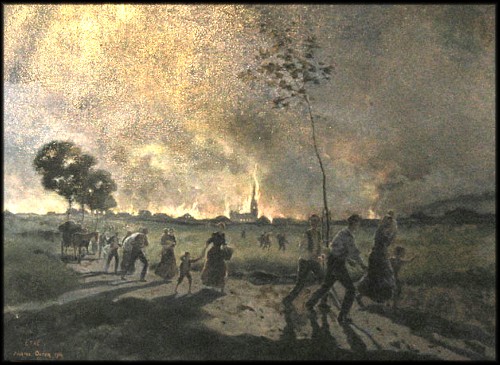 Net zoals Nestor Outer in Dinant (lees meer in het bericht nestor-outer-en-het-trauma-van-virton/) is er nu ook een kunstenaar die zijn afschuw in kunst verwerkt. Gisbert Combaz (Antwerpen 1869 – Sint-Gillis 1941) maakt onderstaande tekening naar aanleiding van de brand van Leuven.Hij heeft trouwens meer tekeningen gemaakt die geïnspireerd zijn door de Groote Oorlog.