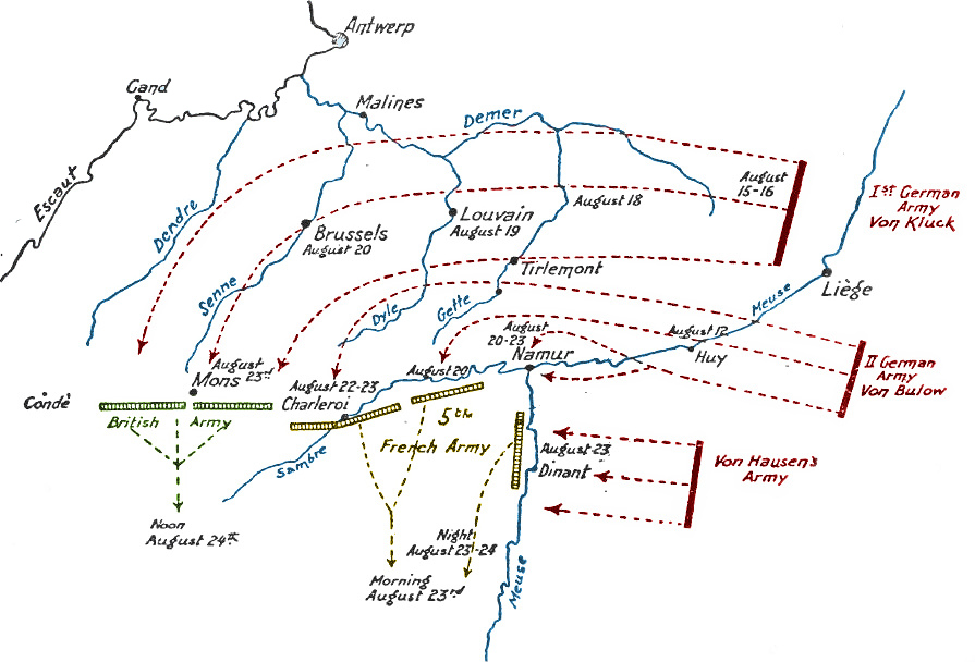 De komende dagen zullen de Duitsers de forten in Namen belegeren. Tussen 23 en 25 augustus 1914 vallen de forten rond Namen één voor één. In die dagen wordt er ook gevechten in Charleroi, waarbij de Belgen steun krijgen van Britten en Fransen. Ook in Bergen wordt er gevochten op 22 augustus en ook hier zijn er Britse en Franse troepen betrokken. Deze gevechten staan bekend als de slag aan de grenzen (“bataille des frontières”).