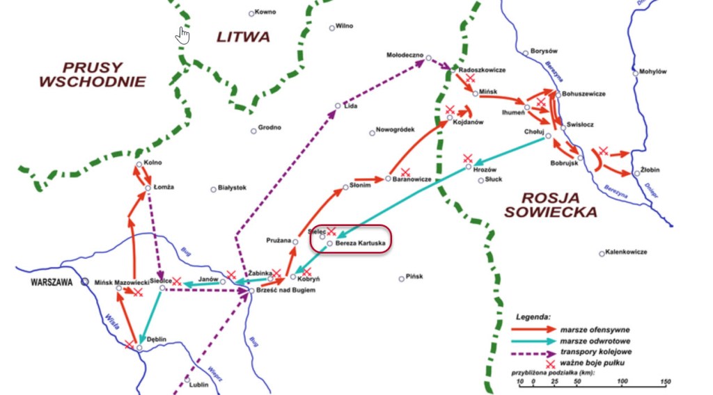 Vaak wordt 14 februari 1919 gezien als de startdatum voor de Pools-Russiche oorlog van 1919-1920. Dan vindt een eerste schermutseling plaats in Bereza Kartuska tussen Poolse soldaten en soldaten van het Rode Leger. De Polen halen de bovenhand en verjagen de Russen. In 1920 vindt de 2e slag om Bereza Kartuska plaats.