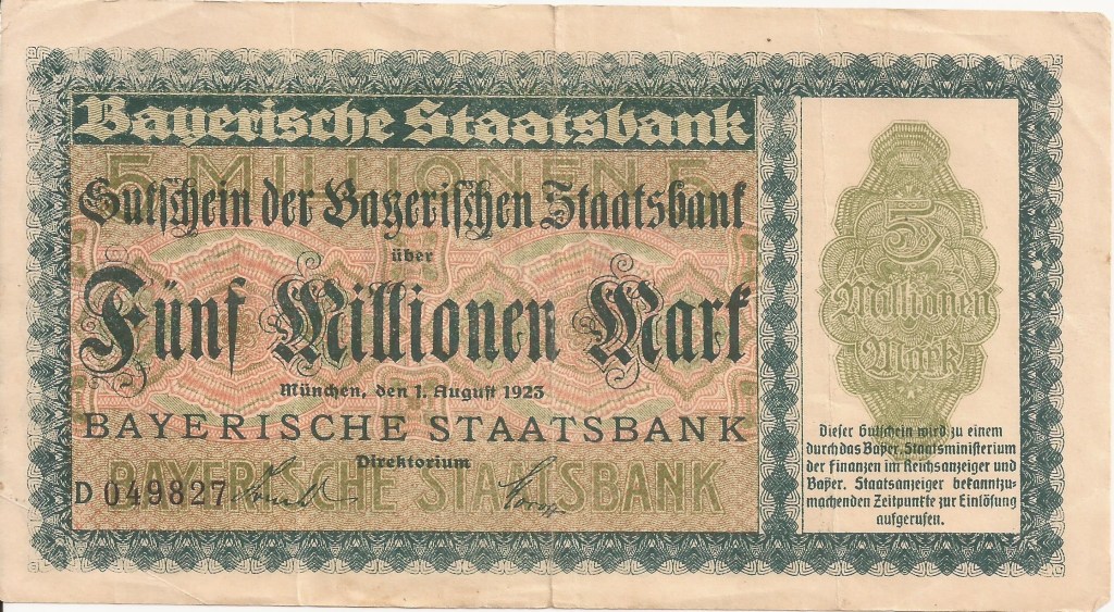 In Duitsland probeert de regering van Cuno in de zomer van 1923 wanhopig de inflatie te bedwingen. Het hoofdprobleem is dat deze regering het passief verzet in het Rijnland, bezet door Belgische en Franse soldaten, wil steunen door de lonen verder te blijven uitbetalen. Maar de inkomsten blijven uit en dus stijgen de schulden van Duitsland de hoogte in. Om die schulden de kunnen betalen, worden er Marken bijgedrukt.