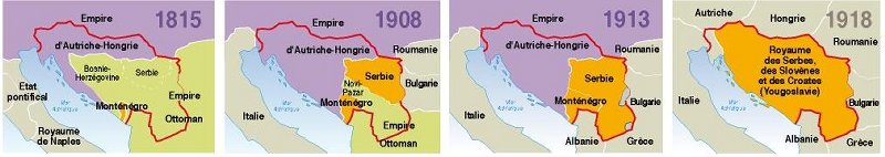 Hieronder zie je de evolutie van Servië als onderdeel van het Ottomaanse rijk (1815) naar onafhankelijkheid (sinds 1878) met in 1908 een gebiedsuitbreiding in Montenegro en een verder gebiedsuitbreiding in 1913 na de 2 Balkanoorlogen. In 1918 is het einddoel van de Serviërs een feit : Joegoslavië omvat alle Serviërs, Bosniërs, Kroaten en Slovenen in één staat.