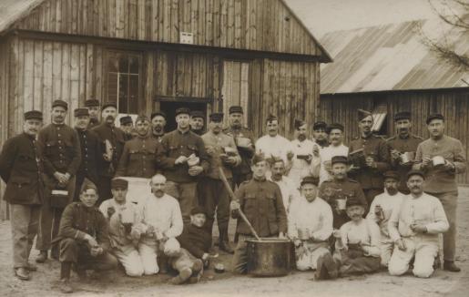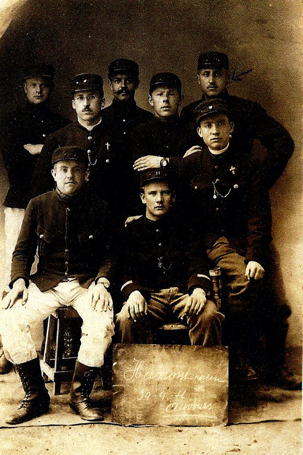 Al googelend kom je soms op webpagina’s terecht waarvan je achteraf niet meer weet met welke zoekwoorden je daar gekomen bent. Als ik me goed herinner, was het met de zoekwoorden Auvours + 1916. En daar kwam ik uit op de website van Hamont-Achel.Onderstaande foto is te zien op de webpagina van de stad Hamont-Achel. De man waar de pijl naar wijst is de vader van Guido Feijen. Mijn grootvader Martinus Evers is de man achteraan links.