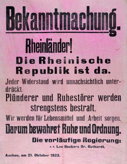 Als de inwoners van Aken op de ochtend van 21 oktober 1923 door de straten lopen, zien ze overal plakkaten met de titel “Rheinländer ! Die Rheinische Republik ist da !”. Sinds 4 uur ’s morgens hebben de Rijnland separatisten gebouwen bezet : het stadhuis, gebouwen van de post, de Reichsbank en andere gebouwen van overheidsinstanties.  En overal wappert een nieuwe vlag : groen – wit – rood. De separatisten willen een eigen staat, los van Berlijn en onder Franse bescherming.