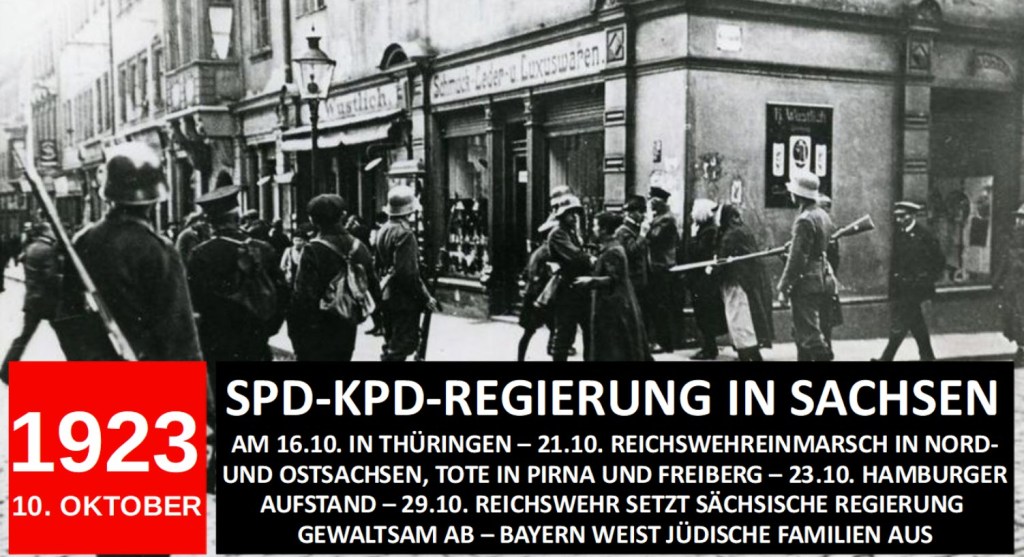 En dus laat men op 5 oktober 1923 de communisten tot de regering van Saksen toetreden. De minister-president Zeigner ziet zijn regering als brandmuur tegen de volks-nationalistische samenzwering in Beieren en als verdediger van de Duitse republiek. In Berlijn ziet men deze stap als een groot risico voor een nakende communistische revolutie. En dus verbiedt de federale regering de Hundertschaften. Dat lokt dan weer een protest uit van de Saksische regering. Op 19 oktober 1923 stuurt de federale regering versterkingen naar de Reichswehr in Saksen. Het risico op een Duitse burgeroorlog is weer een stap dichterbij.