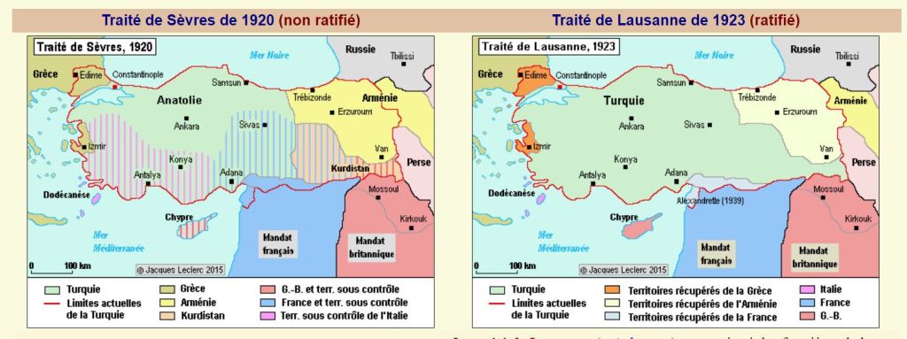 Het verdrag van Lausanne legt de huidige grenzen van Turkije vast. In vergelijking met het verdrag van Sèvres wint Turkije gebieden van het Ottomaanse rijk die in 1920 aan geallieerde naties zijn toegewezen. In de afbeelding hieronder is duidelijk te zien welke gebieden Turkije erbij krijgt ten nadele van welke geallieerde natie.