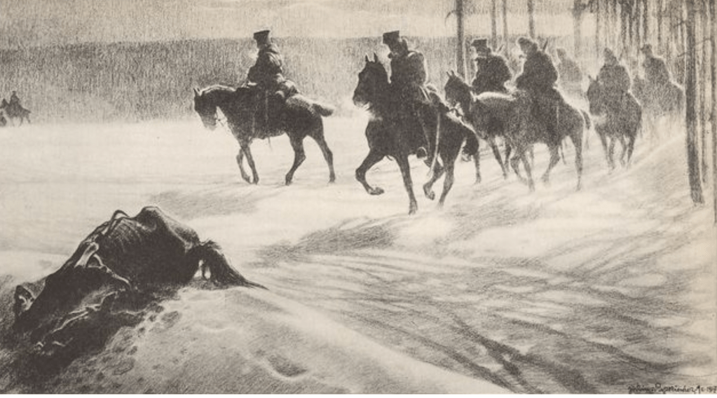 Onderstaande tekening is van Jozef Ryszkiewicz, getiteld “cavalerie op mars”.