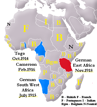 Op onderstaande kaart staan de vier Duitse kolonies in Afrika. Kameroen staat in het rood weergegeven. De kleinste kolonie is Togo. Links onder is Duits Zuidwest-Afrika (Namibië) en rechts Duits Oost-Afrika (Rwanda, Burundi en Tanganyika).